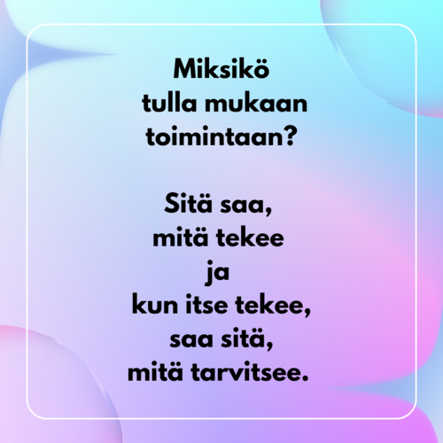 Yhdistys toimii vapaaehtoisin vertaisvoimin, tule mukaan osallistumaan ja tekemään🤗.