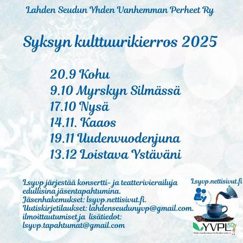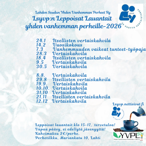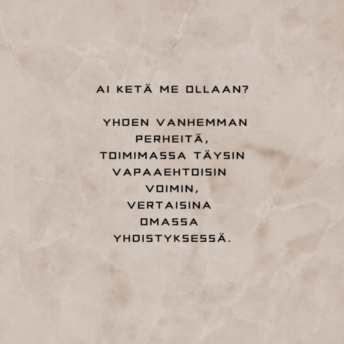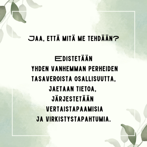 Järjestämme jäsentapahtumia ja kaikille yhden vanhemman perheille avointa toimintaa. Tervetuloa!